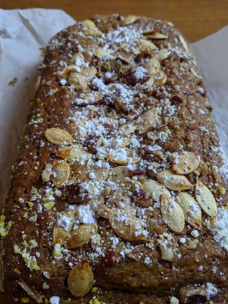 As a special addition, I roasted pumpkin seeds and topped the bread with the pumpkin seeds and powdered sugar.