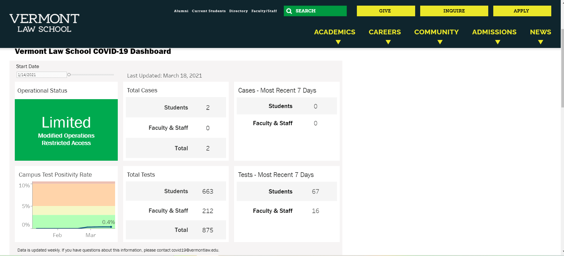 VLS provides COVID-related information for the community on its website, including how to access campus, protocols for accessing campus, frequently asked questions, information on signing up for testing, and a portal for reporting violations of VLS’s COVID-19 policies. Additionally, the dashboard continues to provide case and testing statistics and information about the school’s operational status.