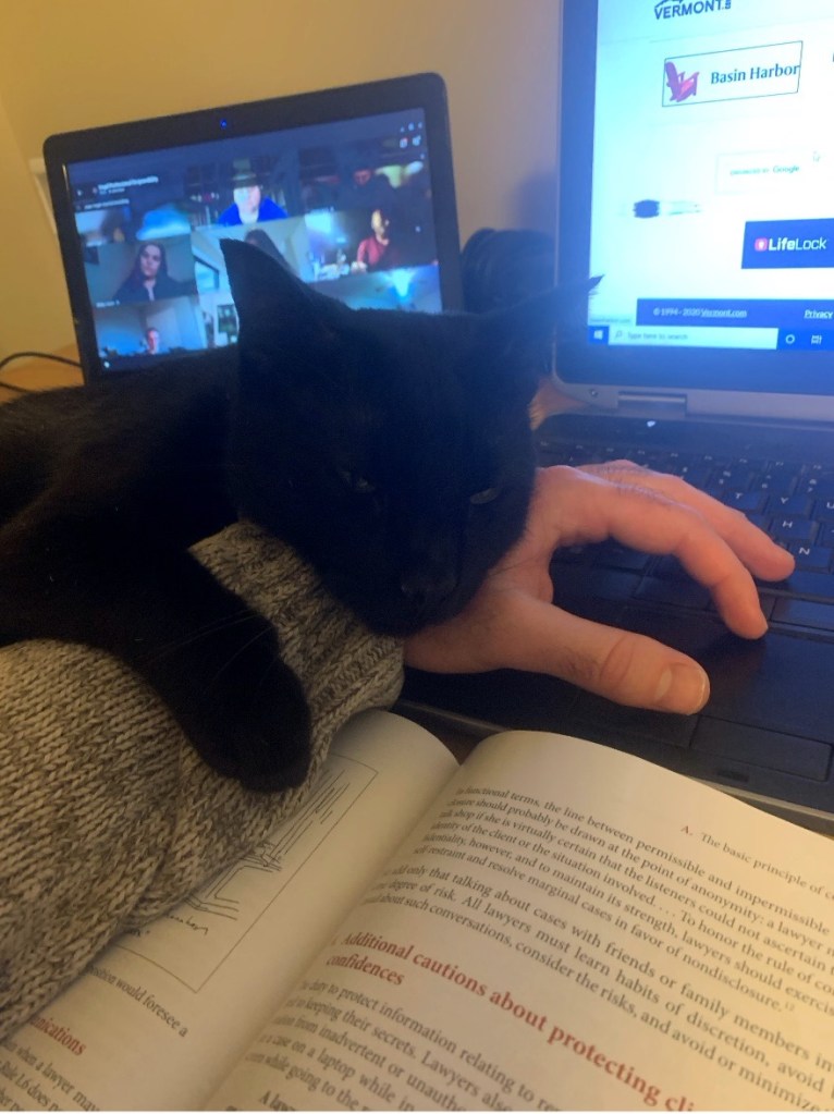 Hi VLS! My name is Zander or Xander depending on which parent you ask. I’m pursuing my honorary J.D. from Vermont Law School and honorary D.P.T. from Franklin Pierce University. My favorite activities include dragging my toy mousey around the house and begging someone to play with me, Auntie Heather Francis playing hide-n’-seek with me and mousey, Auntie Ashely Monti catsitting (she spoils us with wet food!), bugging my brother, and assisting my dad with all sorts of tasks – my favorite being brewing beer! I’m excited for the warmer months because that means open windows and sunshine!