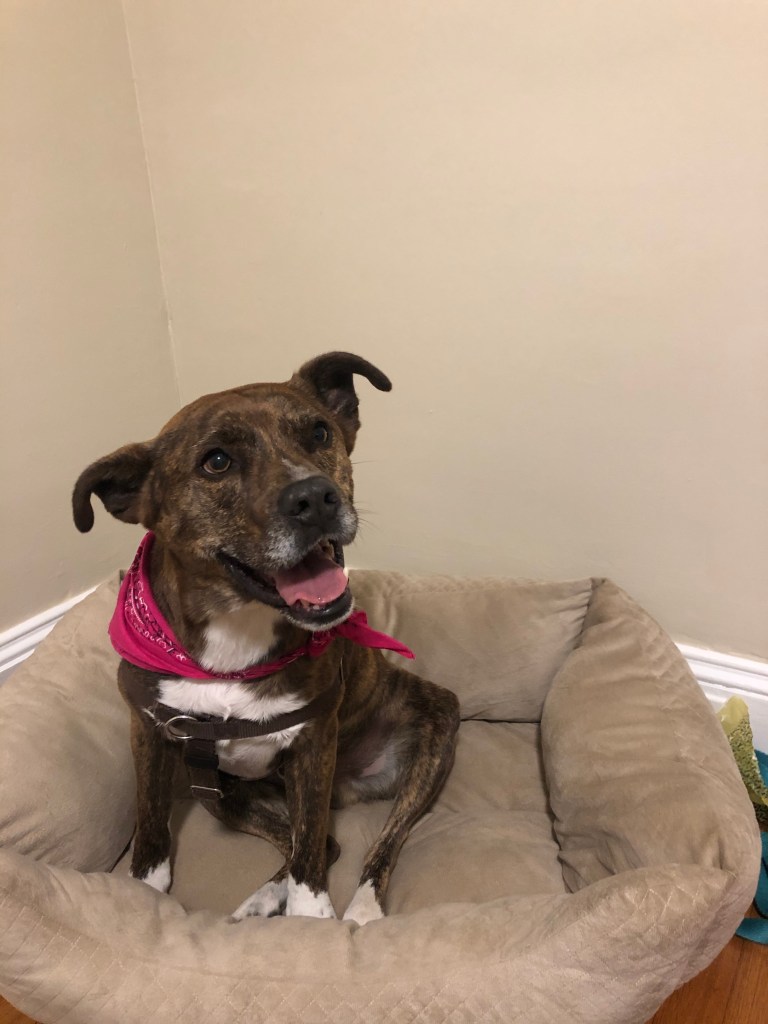 Penny is a beloved pandemic pup breaking hearts in the Old North End of Burlington. Her likes include cuddling with her moms, playing fetch and tug with her moms, watching her moms do stuff, and corralling her moms when they are in different rooms. Also likes walks, chirping birds, cabbage scraps, and perching by the window to watch the neighborhood go by. Will consider friendship with new dogs who are as shy as she is. Will consider friendship with new humans bearing mozzarella cheese!