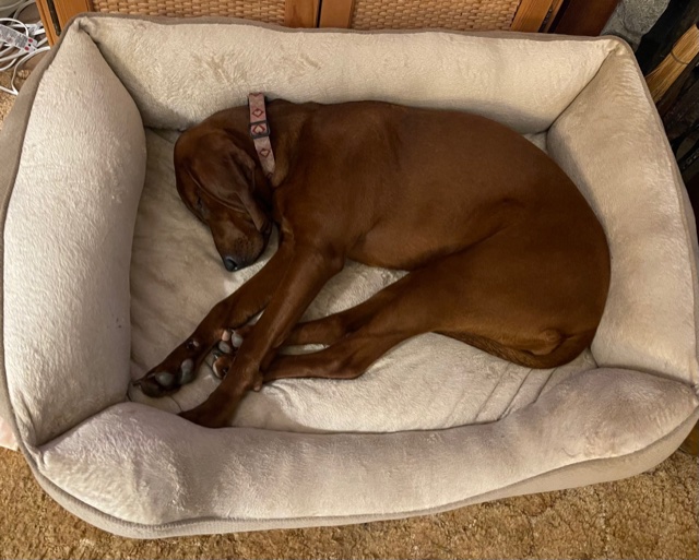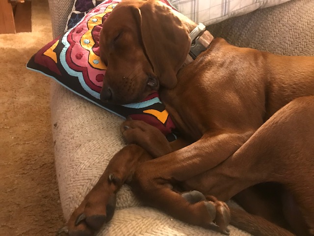 Tig the hound is ruled by her nose, so it has taken some time to train her. She’s basically still in training. We had help from a great gal named Paula who runs a place called Good Dogma. Tig is headstrong and demanding, she talks a lot and when she gets going, she has a beautiful singing voice, which just cracks me up. She is also playful and loving. In the sunlight, her red coat is gorgeous. She goes to doggy daycare three times a week where she meets up with her buddies, plays like crazy, and comes home exhausted. On her days at home, she’ll sleep until noon.
